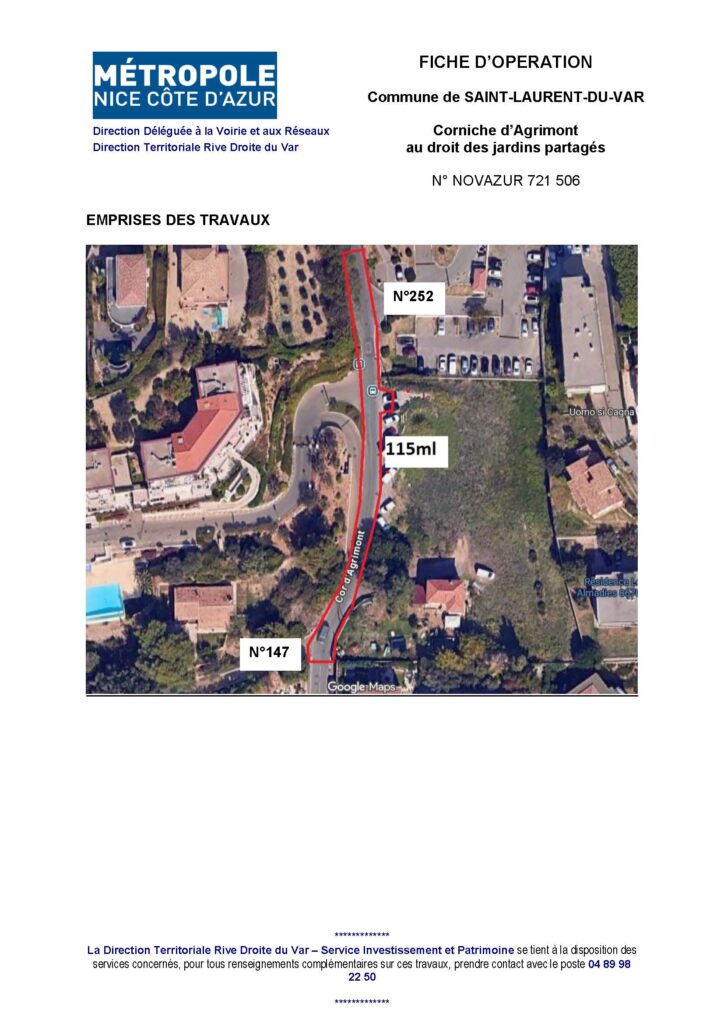 Objet des travaux : Renforcement de chaussée entre le n°147 et le n°252 de la Corniche d’Agrimont (finalisation des travaux en accompagnement de la livraison des jardins partagés)