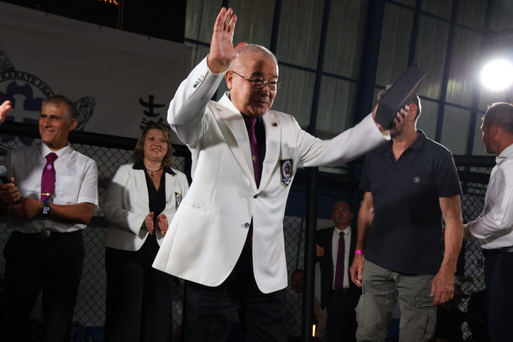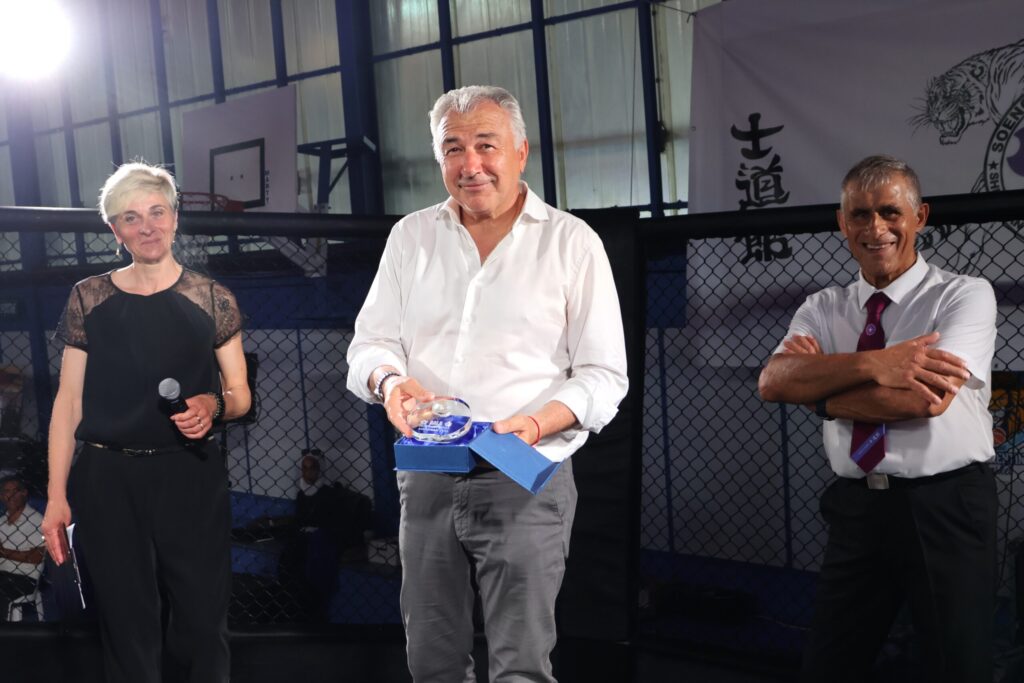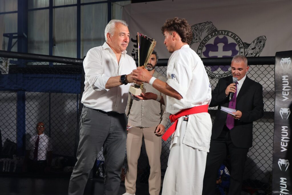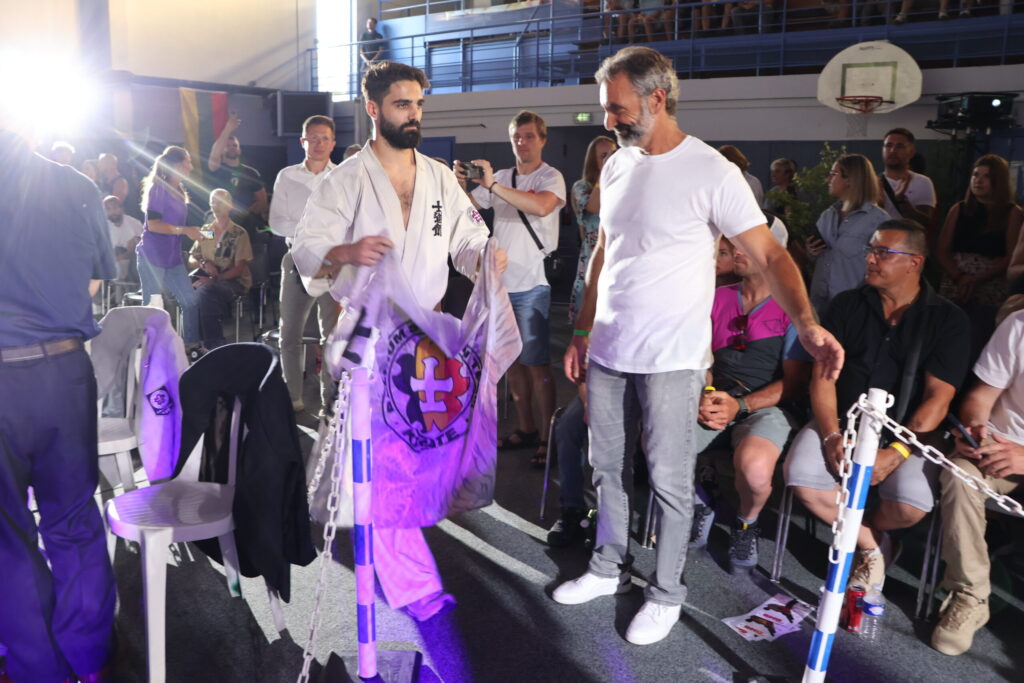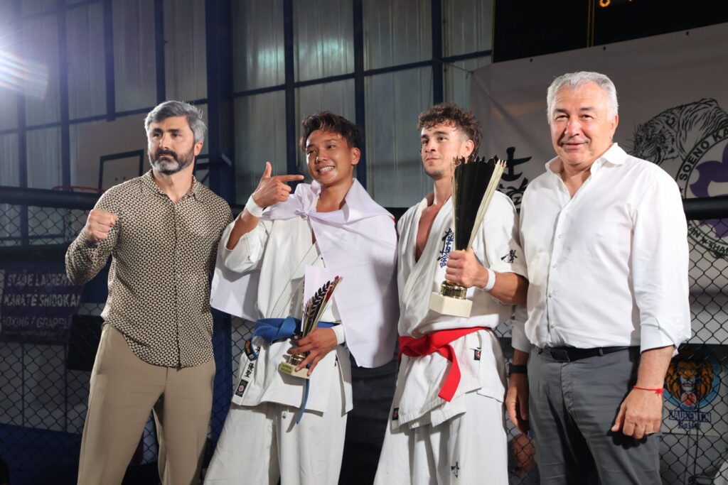 Avant de lancer les combats, Joseph Segura, maire de Saint-Laurent-du-Var, entouré de Gilles Allari, adjoint aux sports, et Yoann Suau, conseiller municipal délégué aux animations sportives, a remis un cadeau de la part de la ville à Maître Sosui Soeno, descendant direct des samouraïs, qui n’est autre que le fondateur du karaté shidokan.