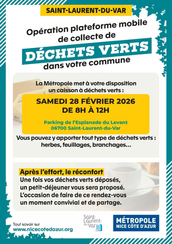 La Métropole Nice Côte d’Azur et la ville de Saint-Laurent-du-Var organisent une collecte de déchets verts, samedi 28 février, de 8h à 12, sur l’esplanade du Levant.