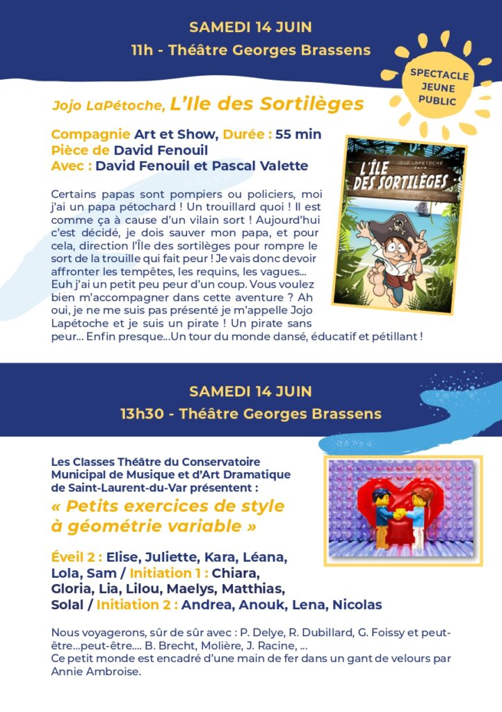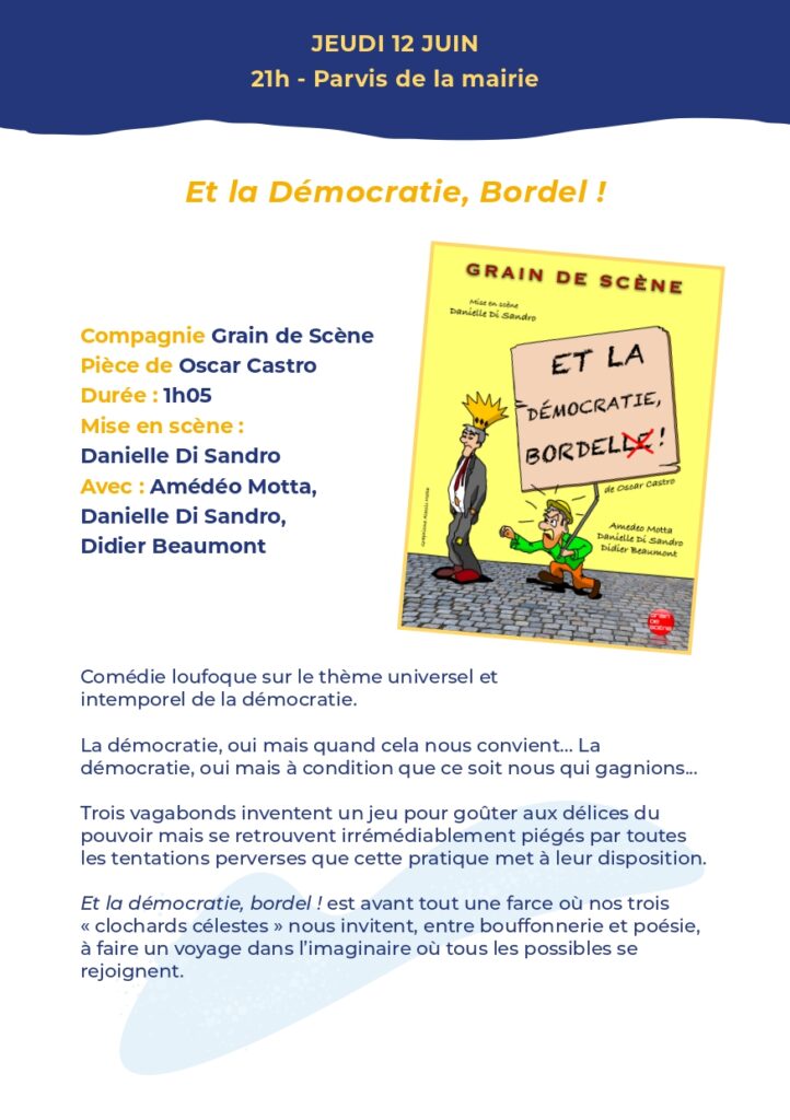 Du jeudi 12 au samedi 14 juin 2025, les comédiens se produiront sur le Parvis de l’Hôtel de Ville et au Théâtre Georges Brassens.