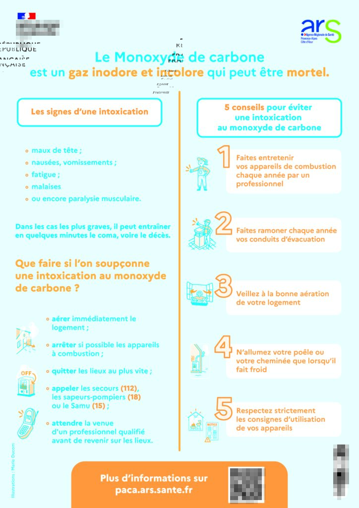 L’agence régionale de santé Provence-Alpes-Côte d’Azur (ARS Paca) a édité un document pratique qui recense les conseils utiles pour éviter une intoxication au monoxyde de carbone ainsi que les signes qui peuvent alerter sur une intoxication.