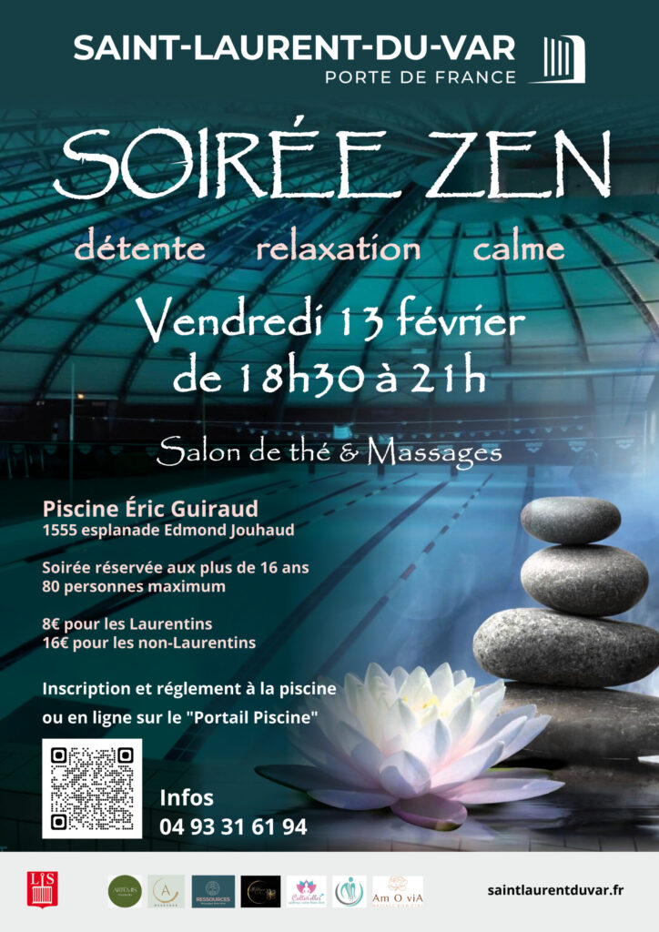Vendredi 13 février 2026, de 18h30 à 21h, la piscine municipale Éric Guiraud de Saint-Laurent-du-Var organise une nouvelle “soirée zen”.